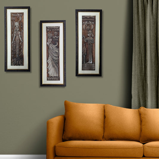 Wall Decor Copper Foil Three Egypt Mythology Panels with Mounting, Plastic Glass and Synthetic Wood Frame (8.5X21 Inch, 3Pcs)